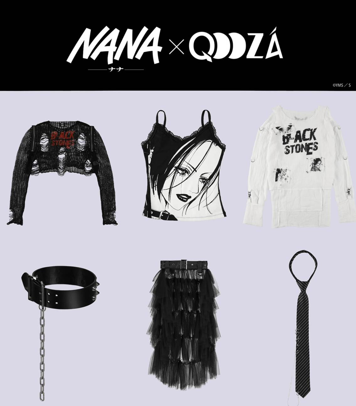 「NANA × QOOZAアパレルアイテム」は伝説のロックバンド《BLACK STONES》をモチーフにしたガーゼトップス・ダメージニット・バッスルパニエ・ネクタイ・チョーカーなど、作品の世界観をそのまま纏える特別なラインナップが登場!