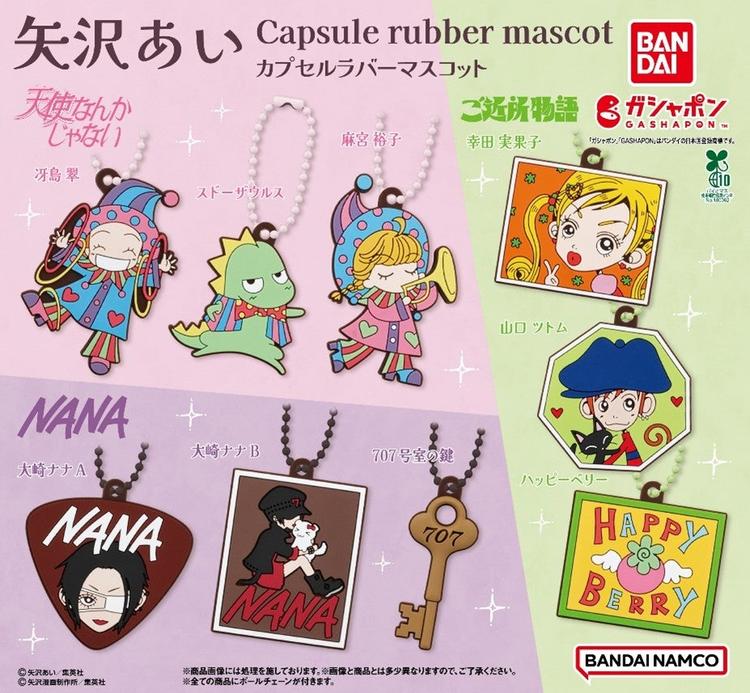 りぼん・Cookieで連載された「天使なんかじゃない」「ご近所物語」「NANA」の付録などのイラストをデザインしたラバーマスコット「矢沢あい カプセルラバーマスコット」(1回300円・税10%込、全9種)(販売元:株式会社バンダイ)が発売されます。